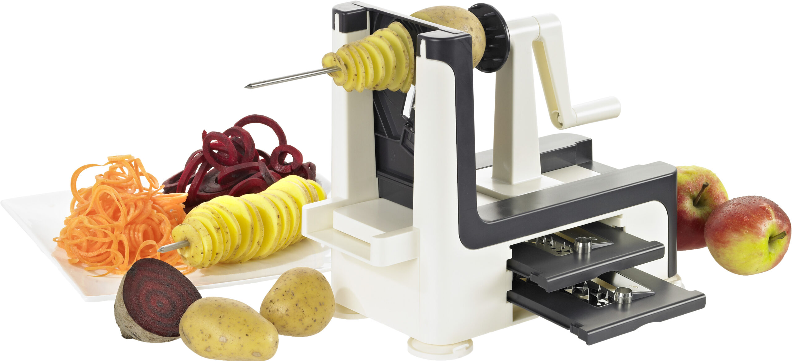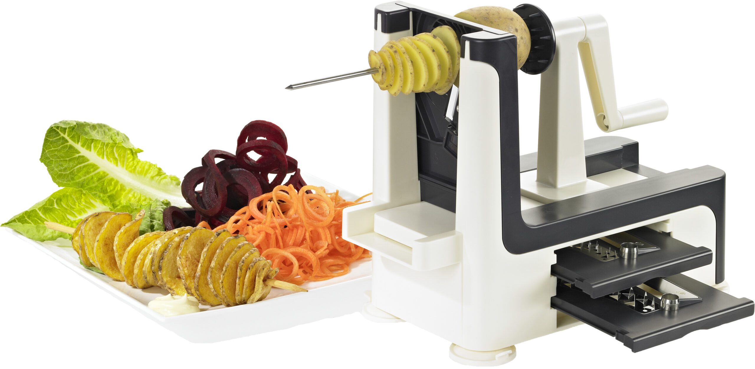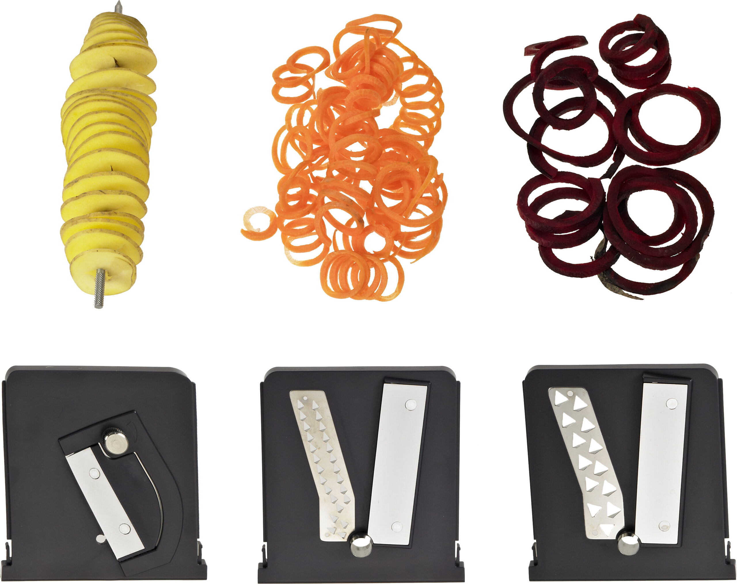 Η καινοτόμα λεπίδα Tornado με πολλαπλές ρυθμίσεις κόβει σπιράλ από 1,5 mm έως 5 mm πλάτος. Νέα επίσης είναι η μεγάλη λεπίδα για σπαγγέτι, ιδανική για έξτρα χοντρές “βιδωτές” πατάτες και λαχανικά-σπαγγέτι με διάμετρο 4 mm.