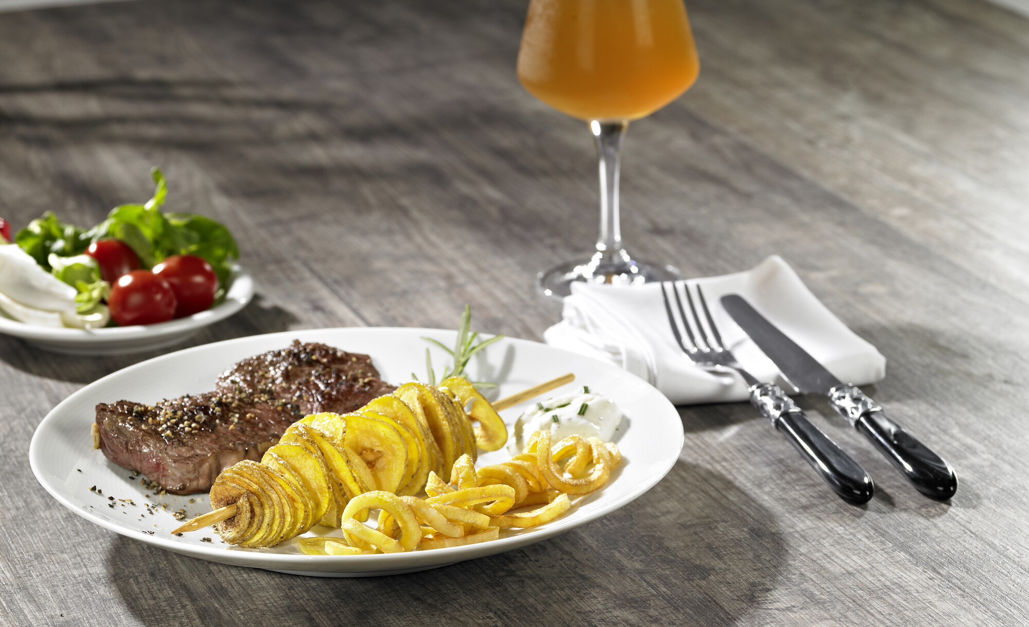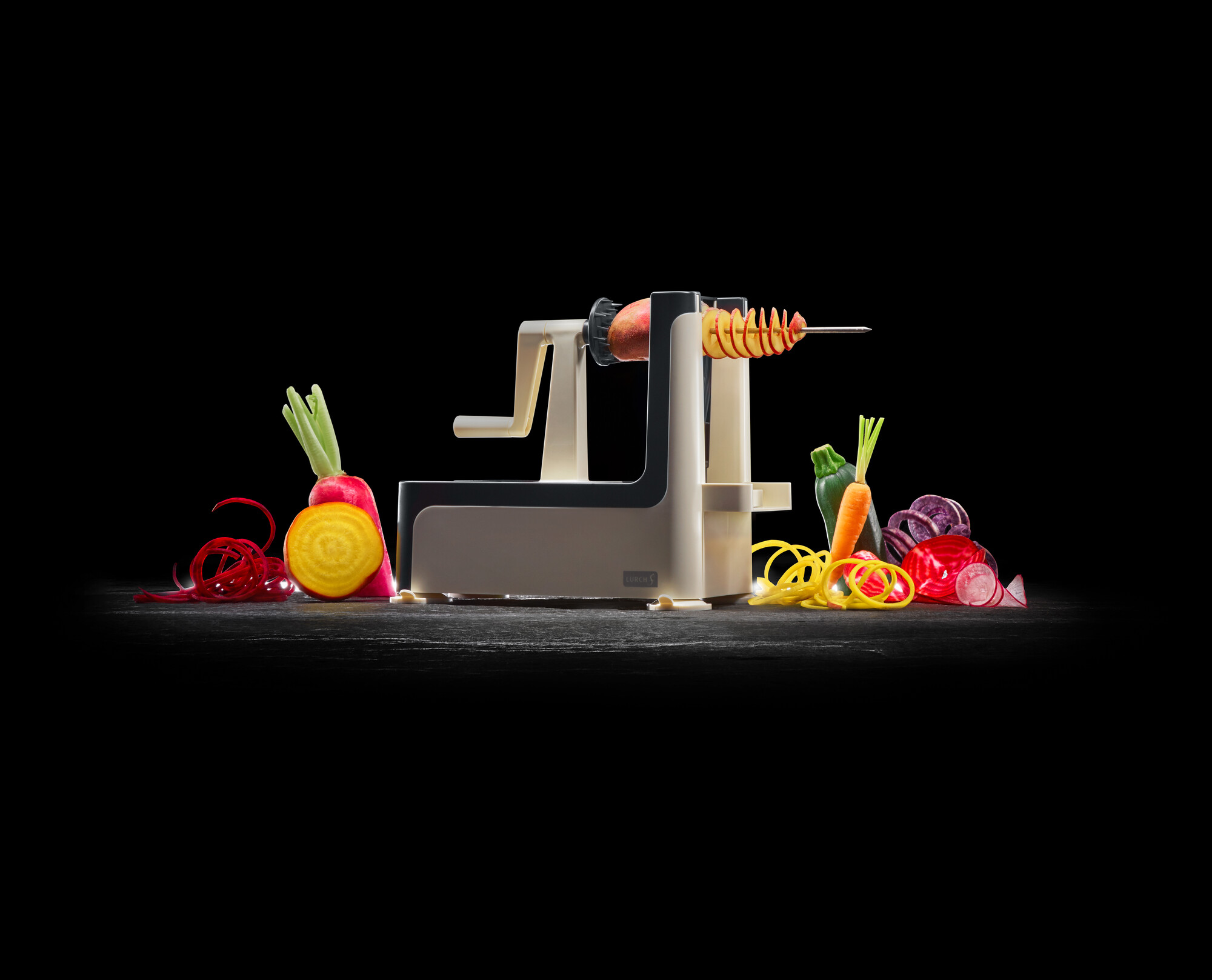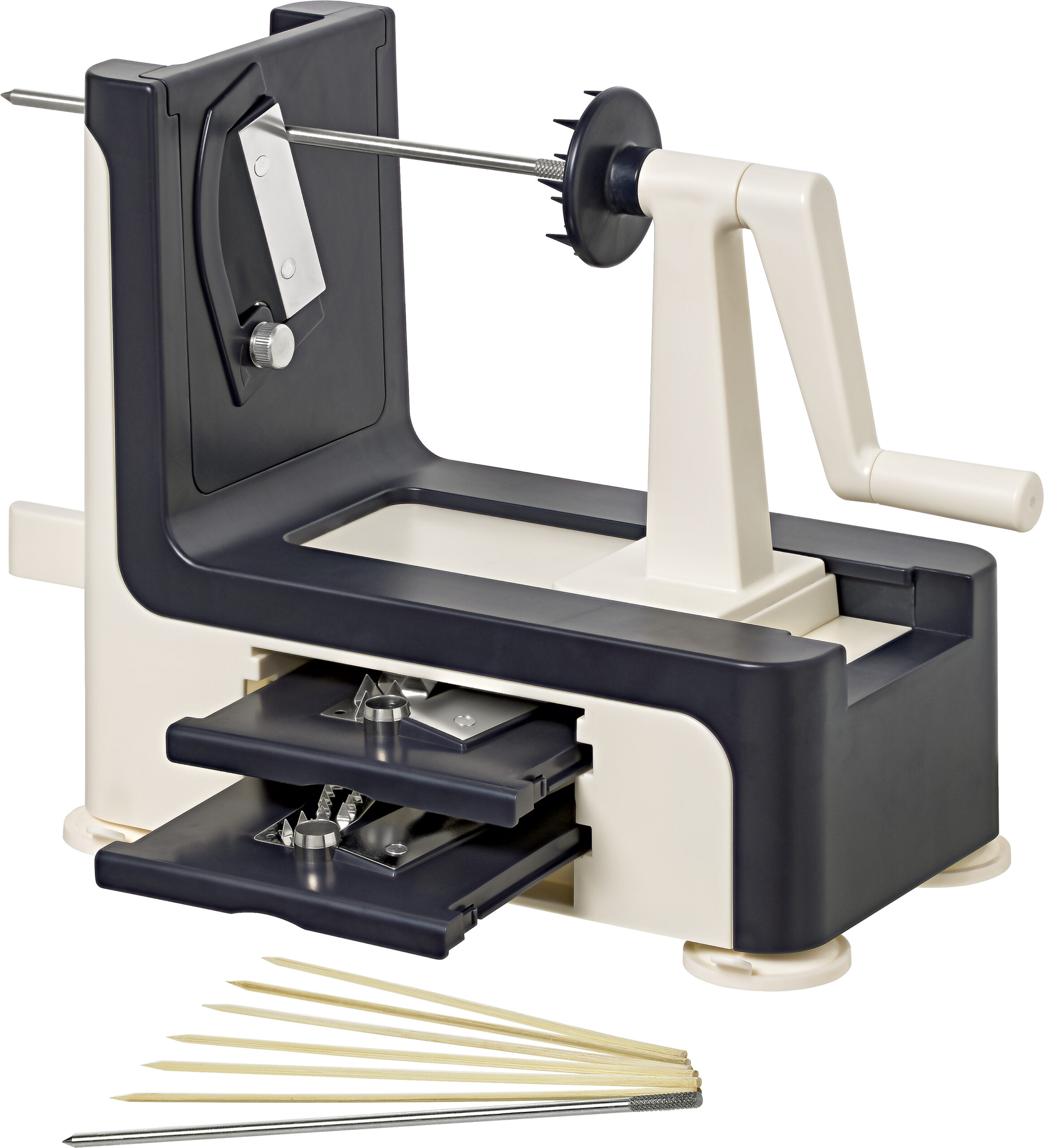 Η καινοτόμα λεπίδα Tornado με πολλαπλές ρυθμίσεις κόβει σπιράλ από 1,5 mm έως 5 mm πλάτος. Νέα επίσης είναι η μεγάλη λεπίδα για σπαγγέτι, ιδανική για έξτρα χοντρές “βιδωτές” πατάτες και λαχανικά-σπαγγέτι με διάμετρο 4 mm.