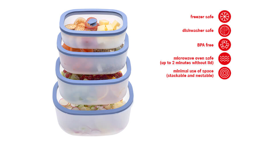 Τα δοχεία κενού από PP και γυαλί μπορούν να χρησιμοποιηθούν στο φούρνο μικροκυμάτων (χωρίς το καπάκι) για έως 2 λεπτά. Μπορούν επίσης να καταψυχθούν και να πλυθούν στο πλυντήριο πιάτων.